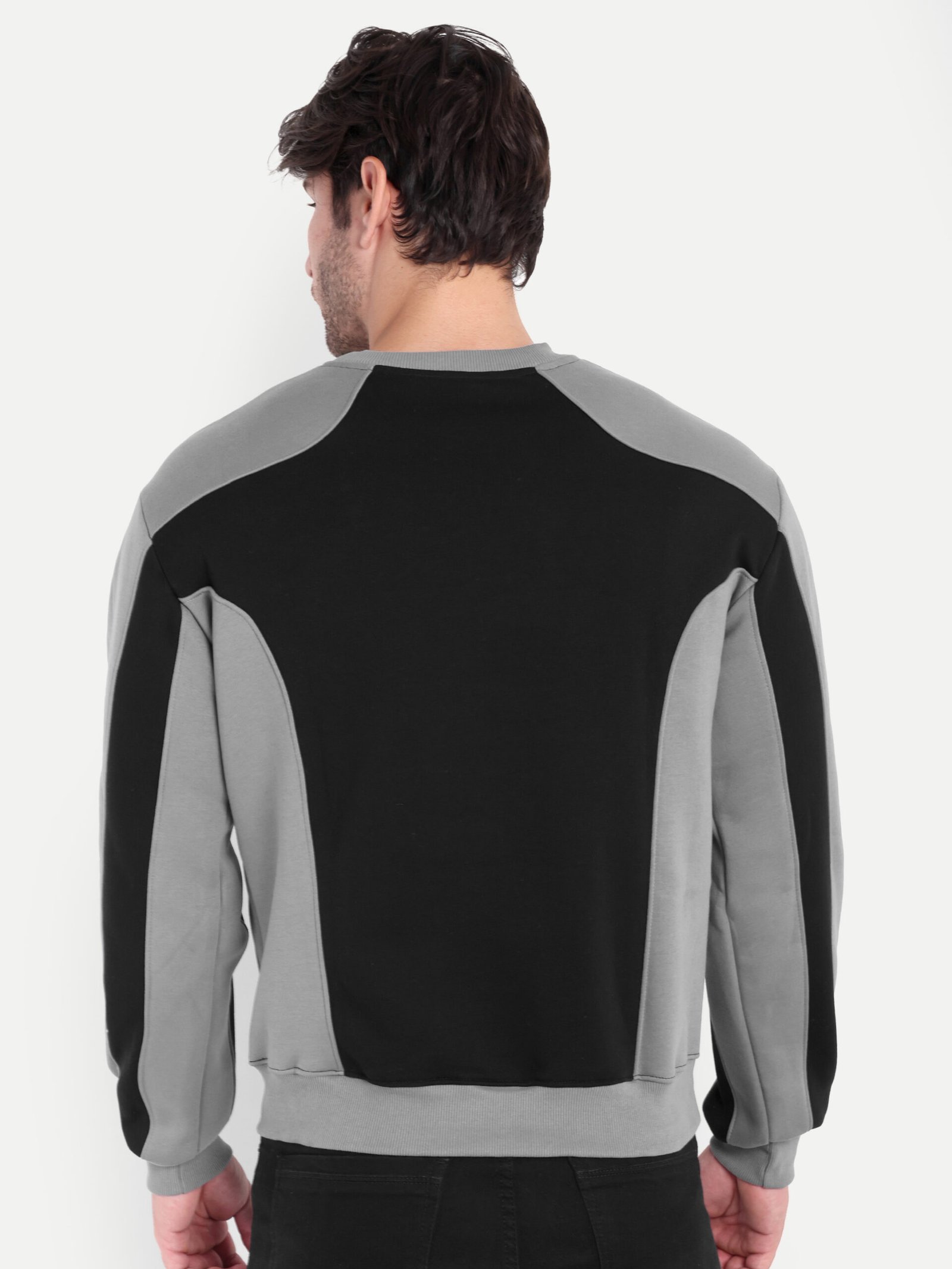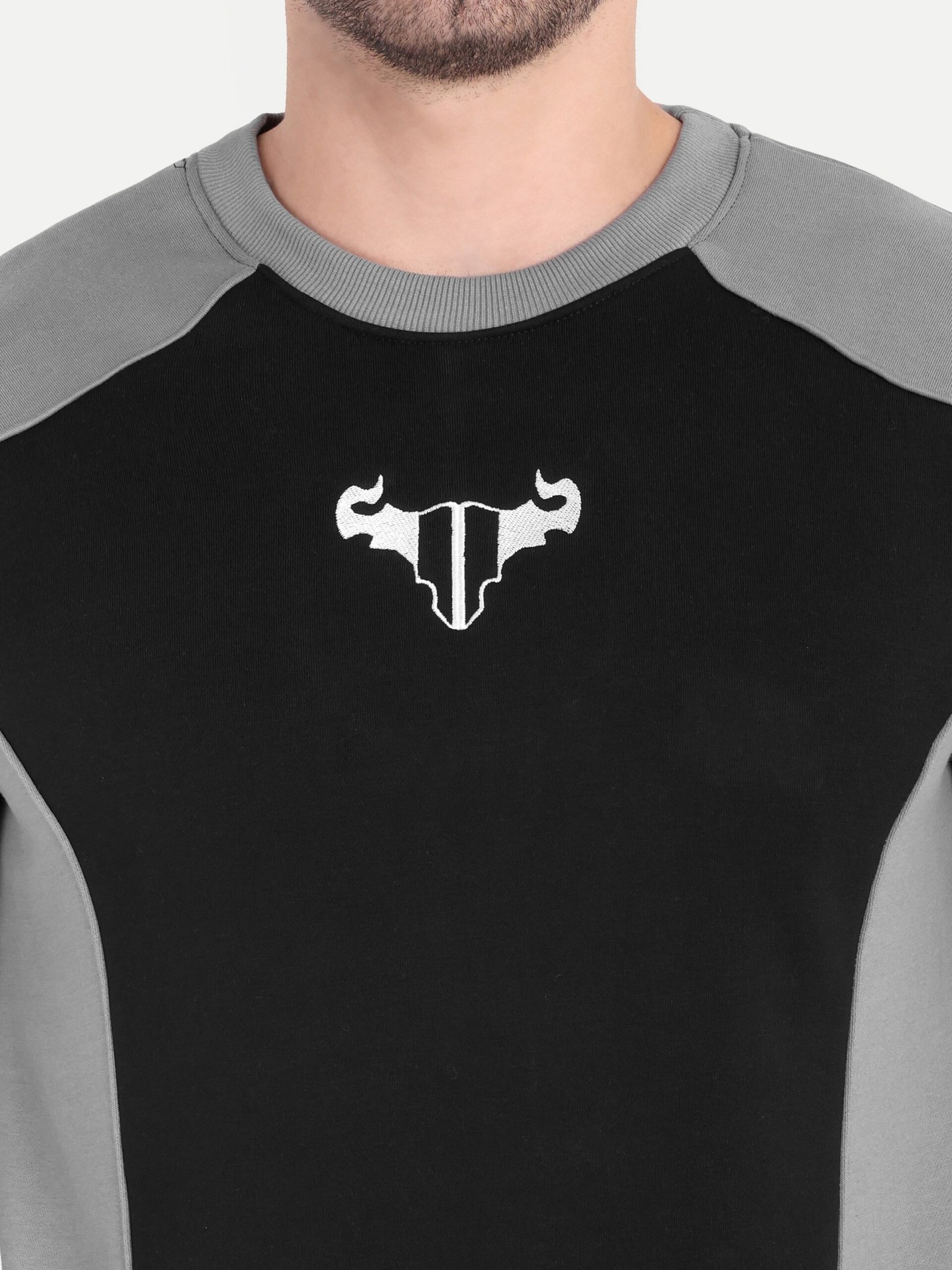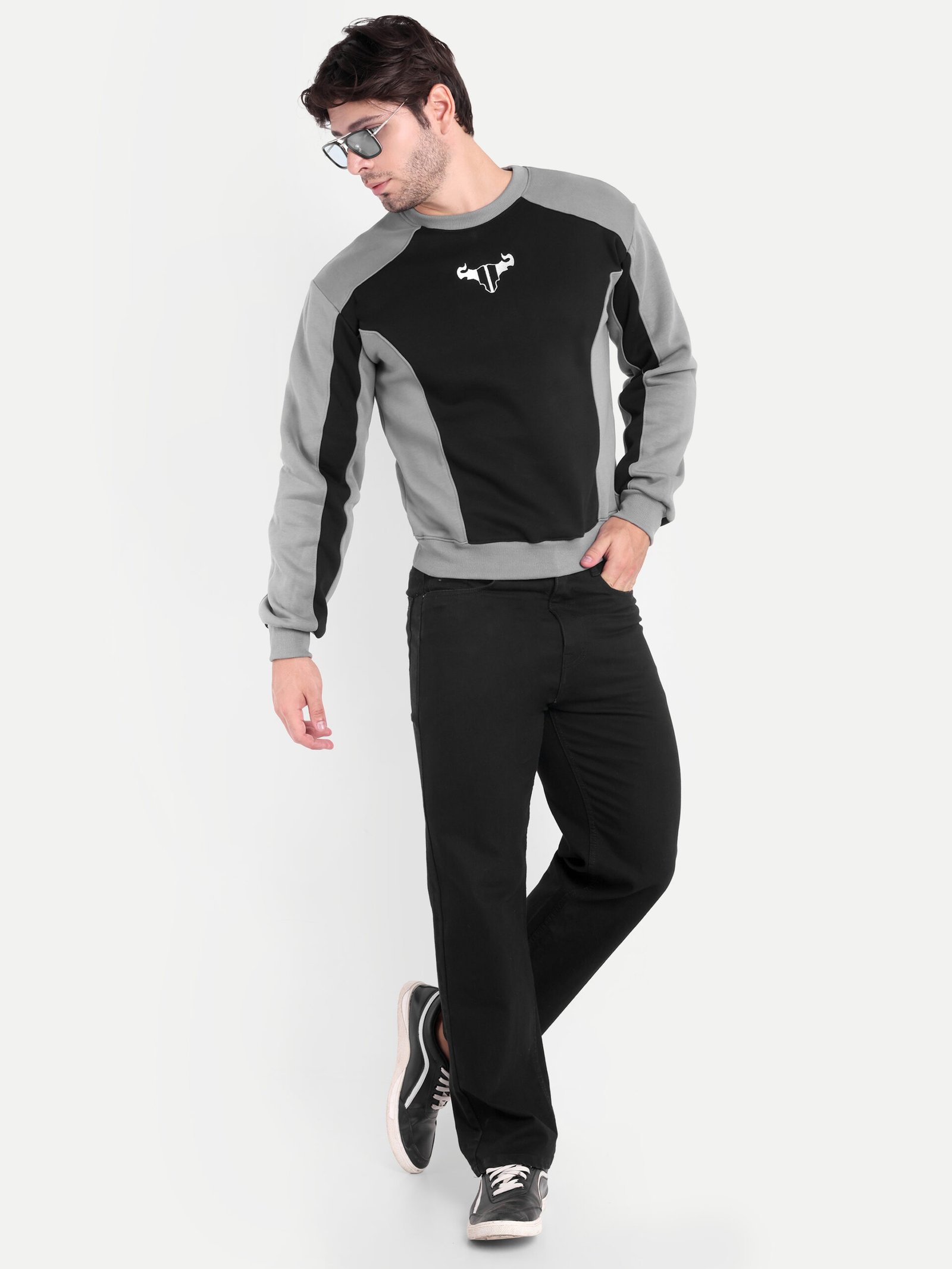 Stay effortlessly stylish with this grey and black colorblock sweatshirt, designed for both comfort and edge. Made from a premium cotton-blend fabric, it features a bold two-tone panel design and a striking bull-head chest graphic that adds a modern streetwear touch. The crew neck and ribbed cuffs ensure a snug, easy fit, making it perfect for casual outings, gym sessions, or relaxed weekends. Pair it with black joggers or denim for a clean, sporty look.